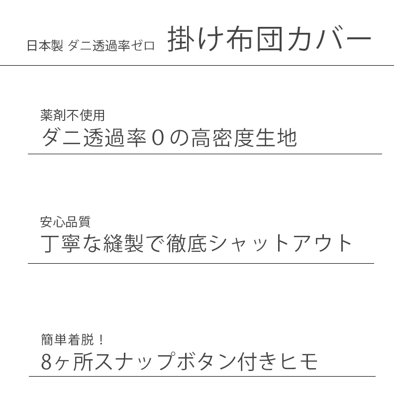 敷き布団カバー 敷き布団カバー(無地) SL 敷き布団カバー(無地) SDL 敷き布団カバー(無地) DL BOXシーツ BOXシーツ(無地) S BOXシーツ(無地) SD BOXシーツ(無地) D BOXシーツ(無地) Q BOXシーツ(無地) K フラットシーツ フラットシーツ(無地) S フラットシーツ(無地) SD〜D フラットシーツ(無地) Q〜K 枕カバー 枕カバー(柄あり) 43×63cm 枕カバー(無地) 35×50cm 枕カバー(無地) 43×63cm 枕カバー(無地) 50×70cm 高密度生地の防ダニカバー 薬剤不使用 超極細繊維を高密度に織り上げることにより、繊維の隙間がなく、ダニやホコリ(ハウスダスト)、が入り込むことができません。防虫剤などの薬品を一切使用してないので、お子様やお年寄りにも安心です。 赤ちゃんにも安心 ホルムアルデヒト検査にて、吸光度0.05以下をクリア!この数値は乳幼児に対する基準値です。 洗濯しても効果は持続 薬品加工の防ダニ生地は、数回洗濯をすると防ダニの効果が徐々に無くなってしまうのに対し、このカバーが使用している高密度生地は、お洗濯を繰り返しても防ダニ効果が落ちる事はありません。 洗濯ごとに快適に 超極細繊維を使用しているので、高密度でありながらガサツキ感がなく、シルクのような感触です。また、ポリエステル85%、綿15%なのでシワになりにくく、型くずれを起こすことはほとんどありません。しかも、洗えば洗うほどに通気性が増し(下記の試験結果参照)、不快感の原因となるムレ感がありません。 keyword | 高密度生地 防ダニ ダニ忌避 ダニ アレルゲン アレルギー 対策 寝具 洗える 薬剤不使用 薬品不使用 日本製 国産 掛け布団カバー かけカバー 掛けカバー ボタン 花柄 はながら フラワー オーナメント エレガント ヴェルサイユ ベルサイユ ナチュレ ルネ 高橋ふとん店 西川のおすすめの布団カバー特集! 布団カバー 西川 セール こだわり安眠館のセール会場はこちらダニも嫌、でも薬品も嫌。 防虫剤は一切不使用の高密度生地!お布団は皮脂・髪の毛・汗からの老廃物が蓄積して、それを餌にするダニの温床になってしまうことも。アレルギーを持っていなくてもぞっとするのに、実際に悩んでいる方には本当に心配です。でもだからといって毎晩お肌に触れる寝具に薬剤を使うのも心配…。そんなあなたに知ってほしい高密度生地。 各項目とも、きちんと検査しています。一口に安全だとか便利だとか言っても、目に見えないものは信じがたいのが事実です。少しでも安心したお買い物をしていただきたいので、各項目とも検査を行い証明書を得ています。 丁寧縫製で侵入ブロック ファスナーの取り付け表から本縫い縫製をします。さらにファスナー止めの部分からダニの侵入を防ぐ為ステッチで抑えて隙間を無くします。 裏面の縫製裏面はロックミシンでチェーンステッチと直線縫いをします。さらに裏面から本縫いをし、二度縫い(ダブルステッチ)で、ダニの侵入を防ぎます。 Detail 寝相が悪い+蝶結びが苦手(面倒)な人はコレカバーの紐はちゃんとお使いですか?実はこれが「ある」と「ない」じゃ全然寝心地が違う!人は寝ている間に何度も寝返りをうつもの。その際にカバーとお布団がしっかりと固定されていないと、中でぐちゃりとズレてしまう。ズレた布団はもちろん寝心地がわるい!ぜひ知っておいて欲しい「ひも」の必要性。なんと素敵なスナップボタン付き!不器用さんも必見です。 ヴェルサイユ ナチュレ ルネ 無地 ※写真はイメージです。写真シングルロングサイズを使用しています。※こちらは掛け布団カバー単品の買い物かごです。 Spec -商品詳細- サイズ シングルロング:約150×210cm シングル超ロング:約150×230cm セミダブルロング:約170×210cm セミダブル超ロング:約170×230cm ダブルロング:約190×210cm ダブル超ロング:約190×230cm クイーンロング:約210×210cm キングロング:約230×210cm 収縮率:タテ-1% ヨコ-1%(JIS.L-1042D法) 組成 ポリエステル85%、綿15% 仕様 YKK全開ファスナー 8ヶ所ボタン紐 ヴェルサイユ・ナチュレ・ルネ(柄タイプ):両面プリント無地タイプ:両面無地 製品重量 本体重量:約700g(シングルロングサイズの場合) 洗濯表示 タンブラー乾燥はお避けください。 長時間のつけ置き洗いはお避けください。 ファスナーを閉じて洗濯をしてください。開けた状態のままだと、ファスナーが故障する場合があります。 生産国・製造地域 日本製 ご注意 できるだけ実物と同じ色合いになるようにしていますが、パソコンモニタの環境などによって実物と色合いが異なる場合がございます。予めご了承ください。 重さの表記をしておりますが、およその値です。わずかですが個体差があることをご考慮下さいませ。 掛け布団カバーのみの販売です。他のカバー、布団、ベッド等は付属しません。ご注意ください。 柄タイプ(ヴェルサイユ・ナチュレ・ルネ)はシングルロングサイズのみの取り扱いとなります。 写真はシングルロングサイズを使用しています。 セミダブル以上のサイズについては、反物の幅の都合上「はぎ合わせ」をして作成して