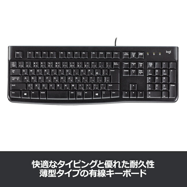 商品詳細 ブランドLogicool (ロジクール) 商品管理番号K120 本体サイズ441 x 149 x 19.5mm 550g ケーブル長1500mm キーレイアウト109キー日本語レイアウト 対応OSWindows7、WindowsRT、Windows8、Windows10 接続I/FUSB K120は快適なタイピングと優れた耐久性の薄型有線キーボード。 手首への負担が少ない薄型の形状、機能拡張Fキーとテンキー付きのフルサイズレイアウトで、キーボードを快適に使用できます。 耐水設計*、最大1000万回のキーストロークに耐える丈夫なキー、角度調節用レッグ。快適性だけでなく、優れた耐久性も備えています。 キーボードをパソコンのUSBポートに接続するだけで、すぐに使用することができる簡単接続も嬉しいキーボードです。 *最大60mlの液体(水)量の試験条件による結果です。液体につけないでください。 ※本製品は日本国内で購入された国内正規品に限り、保証期間内において保証の対象となります。 ※Logitech製品は日本国内での保証の対象外となります。薄型の形状薄型デザインにより、デスクトップをスマートに演出。手首への負担が少ない自然な姿勢でタイピングが可能です。薄型キーで、機能拡張Fキーとテンキーを備えるフルサイズレイアウトにより、静かなタイピングで使いやすい。曲線状のスペースキーで、より自然な位置に手を置くことができるため、快適なタイピングが可能です。 太字で明るい白色の文字によって、誰もがキーを簡単に読むことができ、薄くなりにくいプリントになっています。キーボードをパソコンのUSBポートに接続するだけですぐに使用することができ、折りたたみ式のレッグを広げれば、お好みに合わせて傾きをつけて使用できます。高い耐久性耐水設計、丈夫なティルトレッグや最大1000万回のキーストロークに耐える耐久性のあるキーを備えています。液体はキーボードから排出される設計になっているので、誤って飲み物をこぼしてしまっても心配ありません。※1 最大1000万回のキーストロークに耐える丈夫なキーで、他のキーボードよりも長時間のタイピングが可能です。※2 3年間の無償保証付き。 ※1 最大60mlの液体(水)量の試験条件による結果です。キーボードを液体に浸さないでください。 ※2 Num Lockキーは含まれていません。