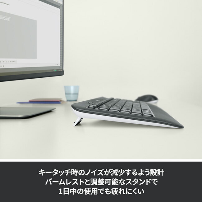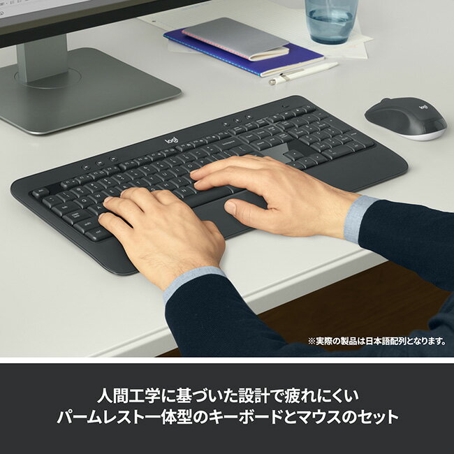 商品詳細 ブランドLogicool (ロジクール)商品管理番号MK540本体サイズキーボード:457.3 × 193.5 × 24 mm 805 g(電池含む) 付属マウス:111.5 × 61.8 × 39.2 mm 73.5 gキーレイアウト日本語レイアウト使用電池キーボード:単三形乾電池 x 2本 付属マウス:単三形乾電池 x 1本電池寿命キーボード:最大36ヶ月 付属マウス:18ヶ月対応OSWindows 10以降、ChromeOS無線方式アドバンス2.4GHz(Unifying対応)接続I/FUSB ロジクールより人間工学に基づいた設計で疲れにくい パームレスト一体型のキーボードとマウスのセットが登場。 接続はロジクール独自のUnifying接続に対応、最大6台までのUnifying対応デバイスを1つのUSBで接続可能です。また付属のUSBレシーバーをPCのUSBポートに挿し込むだけで、簡単に使い始められます。 耐水設計のキーボードは、指先になじみやすいキーで快適なタイピング可能。パームレストと調整可能なスタンドで、長時間のデスク作業でも快適さが持続します。また、キーは摩擦による耐性に強いプリントで文字がこすれにくく、高い耐久性で長く使用することが可能です。便利なホットキー付きでメディア、電卓、バッテリーチェックなどの機能に簡単アクセス可能です。 マウスは曲線形状とソフトなサイドのラバーが手のひらにフィットする持ちやすいデザイン。左右対称型で左利きの方でも使いやすくなっています。 キーボードは単三形乾電池2本で最長36ヶ月、マウスは単三形乾電池1本で最長18ヶ月の長電池寿命を実現しています。 【仕様】 ・キーボード キーレイアウト:日本語レイアウト キー構造/デザイン:メンブレン 角度調節機能:有(2段階:4°、8°) 電池寿命:最長36ヶ月(使用環境により異なります) ・付属マウス センサー方式:オプティカル 解像度:1000dpi 総ボタン数:3 スクロールホイール:有 チルト機能:無 電池寿命:最長18ヶ月(使用環境により異なります) 操作距離:10m(使用環境により異なります) 【パッケージ内容】 キーボード、マウス、乾電池(装着済み)、Unifyingレシーバー、保証規定 ※本製品は日本国内で購入された国内正規品に限り、保証期間内において保証の対象となります。 ※Logitech製品は日本国内での保証の対象外となります。 ※本製品にはUnifyingレシーバーが同梱されています。レシーバーの紛失を防ぐため、ご使用前にパッケージ内をご確認ください。パームレスト一体型のキーボードとマウスのセット ロジクールより人間工学に基づいた設計で疲れにくい、パームレスト一体型のキーボードとマウスのセットが登場。 テンキー付きフルサイズのキーボードはなじみのあるキー形状、サイズ、打鍵感を備え、長時間の作業でも疲れにくくなっています。 ノイズが減少するよう設計されたキー/調整可能なスタンド キーボードは精度が強化されノイズが減少するように設計。静かなタイピングのキーボードはパームレストと調整可能なスタンドでキーボードの傾きを変えることができます。 高い耐久性 キーは摩擦による耐性に強いプリントで文字がこすれにくく、高い耐久性で長く使用することが可能です。 左右対称型のマウス マウスは曲線形状とソフトなサイドのラバーが手のひらにフィットする持ちやすいデザイン。左右対称型で左利きの方でも使いやすくなっています。 付属のUSBで簡単接続 接続はロジクール独自のUnifying接続に対応。6台までのUnifying対応デバイスを1つのUSBで接続ができます。USBポートを効率的に使うことが可能です。 ※ 本製品にはUnifying接続対応のUSBが同梱されています。 長電池寿命 キーボードは単三形乾電池2本で36ヶ月、マウスは単三形乾電池1本で18ヶ月の長電池寿命。 ※ 使用環境・状況によって異なる場合があります。