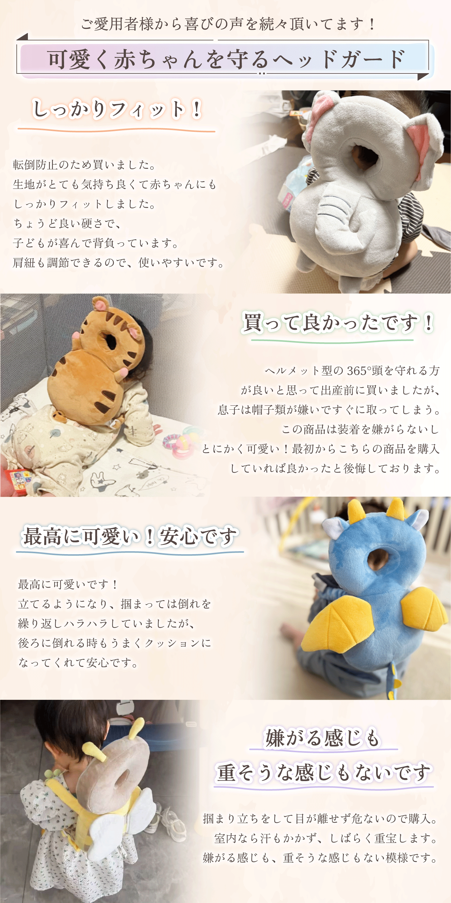 おすすめ商品はこちら ベッドガード 転落 防止5,370円 よだれかけ コットンスタイ1,390円~ 補助便座 踏み台 踏み台セット2,570円~ 水着 レディース ラッシュガード4,150円~ コーナーガード クッション1,080円~ キッズ レインブーツ2,580円 授乳ケープ ポンチョ 授乳ポンチョ 授乳カバー2,680円 手押し車 ベビーウォーカー 乗用玩具6,450円 ベビーチェア 折りたたみ ハイチェア7,210円 備考メーカー希望小売価格はメーカーサイトに基づいて掲載していますふわふわ分厚いコーナーガードクッション↓ 新登場↓ 透明で目立ちにくいコーナーガード\片手で楽々操作╱いたずら防止 窓ストッパーお子さまには外しにくいロック付【商品詳細】 ○重量:約360g ○素材:ポリエステル(クリスタルベルベット)+PP綿 30度以下で手洗い可 ※デザインによりサイズや前面の仕様が異なります 【とら/きりん/ぞう/ かいじゅう】バックルで留めるタイプ サイズ:高さ30x幅19x厚み8cm、留めるベルトは長さ調整が可能です。 【はち/てんとうむし】マジックテープで留めるタイプ サイズ:高さ35x幅20x厚み10cm 留めるベルトはゴム製で伸縮性があります。 ■ごっつん防止!リュック型ぬいぐるみ 見た目も可愛いリュック型ベビーヘッドガード。どこでも一緒に連れて行けちゃいます♪ ■頭や背中の打ち付けを緩和。 お座りや、つかまりだち、よちよち歩きを始めたお子様におすすめ。赤ちゃんの成長に合わせて肩紐で調整可能です。 ■かわいい赤ちゃんのお友達♪ ふわふわな肌触りでぬいぐるみのよう。お出掛けも、おうちでも、お子さまといつもご一緒に。 ■お子さん、お孫さん、お友達へのプレゼントにもおすすめ! つい写真におさめたくなる可愛さで、赤ちゃんにもママにも喜ばれるギフトに♪ ベビー ヘッドガード 赤ちゃん 頭 ガード リュック 転倒防止 ごっつん防止 ベビーヘルメット クッション 頭ガード 保護 出産祝い ベビー用品 男の子 女の子 安全 かわいい はいはい サポーター ギフト プレゼント つかまり立ち 転倒 防止 グッズ 保護パッド ぶつけ 転ぶ 贈り物 転倒防止リュック 頭部ガード セーフティグッズ 手洗い ふわふわ とら キリン ぞう 怪獣 ハチ てんとう虫 お座りつかまり立ち よちよち歩き ぬいぐるみ 写真映え リュック型ヘッドガード 赤ちゃんのごっつん防止リュック H型肩紐 ベビーヘッドガード 怪我防止 頭部と背部への保護パッド 通気性 ごっつ ん防止リュック ヘルメット キッズ 転倒防止クッション 0歳 1歳 クリスマスプレゼント あたま 補助ベルト付 赤ちゃんリュック 赤ちゃんあたまガード 頭を保護できる 安全対策 出産お祝い メッシュタイプ 6~24ヶ月対応 肌触り良い 肩紐調整可能 固定式の補助ベルト付き