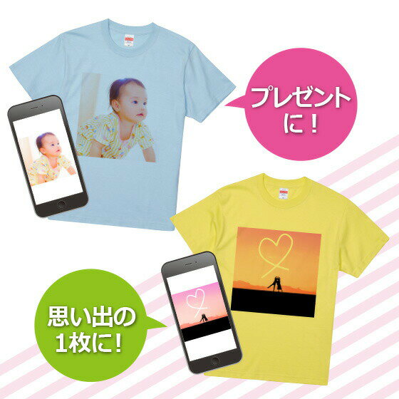 【ご確認ください】 1200円商品はプリント無し、無地のTシャツの場合です。 プリント追加される場合はオプション代金が加算されます。 シミュレータのご案内 写真入り オリジナルTシャツ プレゼント の紹介 笑顔になれるオリジナルアイテム♪ お手元の写真や画像でオリジナルの手作りTシャツが作成できます。 散歩・買い物・ショッピングなどの外出時のオリジナルTシャツがペットの愛犬や愛猫だったり、子供のお絵かきプレゼントの柄のティーシャツだと自然と笑顔に♪ アイデア次第でおしゃれ オリTに! 写真に名前やメッセージを入れた文字入り画像でフォトTシャツ 複数枚の写真を1つにした画像のプリントTシャツ 手書きのイラストや子供の絵もそのままプリント♪ 両面プリントも可能です! 小ロット(1枚から)の注文もOK オリジナルTシャツが1個からオーダーメイドできるので、オリジナルグッズ製作が安い価格でお試しできます。 写真入り オリジナルTシャツ の詳細 ペット写真でグッズを作ろう♪ ペット(犬・猫・鳥・うさぎなど)の写真入りで制作すれば、世界に一つだけのうちの子ペットグッズの出来上がり♪ かわいい愛犬・愛猫のお気に入り写真印刷でつくる写真Tシャツが1つから作成OKできます。 定番の子猫や子犬以外にも、ハムスター、亀、インコ、文鳥、金魚、メダカ、熱帯魚など色んなペットで作成させてもらった実績がございます! 写真へ名入れした画像や、家族写真にネーム入りでご依頼いただくことが多いです。 その他にも、、 ペットロスの家族や友人へ元気になってもらいたく、ペットの写真が使えるオリジナルアイテムをプレゼントとして本商品をお選びいただくケースも。 子供の写真入りプレゼントにもよく選ばれています! ・祖父(おじいちゃん)、祖母(おばあちゃん)へ 長寿祝い(還暦祝い、古希祝い)や敬老の日のプレゼントとして、子どもの写真入りの半袖Tシャツ ・お父さん、お母さんへ 父の日、母の日、勤労感謝の日のギフトとして、子供の書いた似顔絵やお絵描きメッセージを印刷した オリジナルTシャツ ・義父、義母、親戚(兄弟、姉妹)へ 誕生日の贈り物に孫、甥、姪の手書きのイラスト入り半袖シャツ ■イベントごとにも 記念日やバースデー、出産祝い や卒園記念品として形に残る記念品 野球、サッカー、バスケ、ダンス、テニスなど部活動の卒業記念品、卒団記念品 応援している選手やアイドルなどの推し活グッズとして ■お仕事関連用途にも 展示会用にパンフレットを入れたり配布するノベルティ 新しくオープンする店舗(ショップ)のロゴマークやアイコンを入れて販促用のグッズ 写真入り オリジナルTシャツ の商品詳細 サイズ 100 / 110 / 120 / 130 / 140 / 150 / 160 / Sサイズ / Mサイズ / Lサイズ / XL(2L・LL) キッズサイズ用の小さいサイズから大人(アダルト)用のゆったり大きいサイズまでご用意しているので、男性女性問わず色んなシーン・イベントでご検討ください サイズ毎の詳細な着丈等は商品画像より参照ください。※メンズ・レディース兼用(男女兼用/ユニセックス)サイズです。 Tシャツ本体色一覧 ライトピンク / ライトブルー(水色) / ライトイエロー(黄) / ナチュラル (ベージュ) / オートミール(グレー) 素材・生地 綿100% / 5.6oz アパレルファッションブランドとして認知度の高いUnited Athle(ユナイテッドアスレ)を使用 トップス、インナー、カットソーなどカジュアルウェアに幅広く活躍 首まわりの縫製は「ダブルステッチ」仕上げのため、長年着用してもきちんとした首まわりを保てます。 活用シーン ■お祝い・プレゼント・ギフトにて 成人の日 バレンタインデー ひな祭り エイプリルフール 猫の日 こどもの日 母の日 父の日 敬老の日 スポーツの日 勤労感謝の日 いい夫婦の日 ハロウィン クリスマスと一年を通じて活躍するイベントがたくさんございます♪ 結婚祝いや帰省時の手土産、お返しの品やお見舞い用のメモリアルアイテムとしても選ばれています。 長寿(還暦 / 古希(古稀) / 喜寿 / 米寿 / 傘寿 / 卒寿 / 白寿 / 百寿)のお祝いの品として。喜寿祝いや米寿祝いが近年増えてます! ■学校行事にて 学園祭や文化祭・体育祭・運動会や体育大会(スポーツ大会)などの友達や仲間とお揃いのクラT(クラスTシャツ)や先生・教員用のスタッフTシャツとして ■アウトドアイベントなどにて ライブやライブ・お祭りや旅行など、オリジナルTシャツを作成して思い出に残るイベントにしよう スポーツ観戦時の一致団結を表すアイテム、チームメイトや選手メンバーの名前入りで作成すれば応援グッズにもなります。 こんな方におすすめ 息子や娘の成長記録を写真以外のアイテムへ残したいご両親(父親・母親) 旦那さんと妻とでペアルック スポーツ関連のイベントにも大活躍! 試合の応援団のユニフォームとして保護者や関係者がおそろいで準備するもよし。入場や退場時のプレーヤーの気持ちが高まるでしょう♪ 入学・入団の新チーム発足時や、退団・引退・卒部などの卒団式・