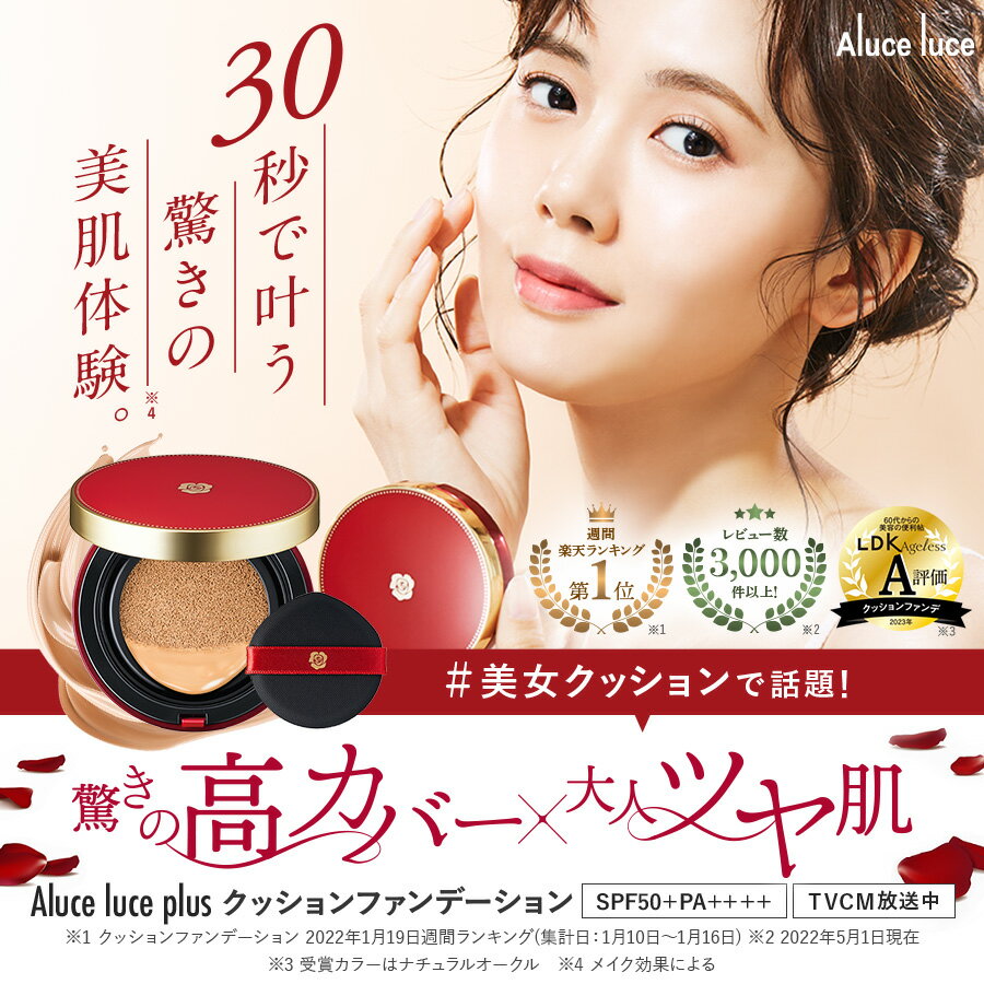※Aluce luceとAluce luce Plusのリフィルは同じサイズのため、ケースを入れ替えてもお使い頂けます。 ※ご注文後の色変更はお受けできませんのでご注意ください。 ※開封後の返品やセット品の一部のみ返品は、お受けできません。ご了承ください。 ※当社は直販のみで「正規品」を販売しています。他の業者から購入された商品は「正規品」と認められないため、保証は一切できません。ご注意ください 全国送料無料 代引き手数料無料 商品の特徴 ■SPF50+ PA++++ ■パフ各1枚付き Aluceluceクッションファンデーションの特長だった高いカバー力&光を味方につけるソフトフォーカス効果はそのままに、密着力とカバー力がUP。 進化したパフの力も併せて、光に映える美しい仕上がりがさらに長持ちします。 美容液・日焼け止め・化粧下地・ファンデーション・コンシーラー・ハイライトの6役をこれ1つで果たすのに、手軽なコンパクト&パフで手が汚れない。 ・パラベン、足付動物由来成分、合成香料、合成着色料、すべて不使用 ・SPFとは、紫外線B波から肌を守る効果を示す指数です。 ・PAとは、紫外線A波から肌を守る効果を示す指数です。 全成分 ▼ナチュラルオークル 水、シクロペンタシロキサン、酸化チタン、メチルトリメチコン、トリエチルヘキサノイン、酸化鉄、フェニルベンズイミダゾールスルホン酸、ナイアシンアミド、ラウリルPEG-9ポリジメチルシロキシエチルジメチコン、トリメチルシロキシケイ酸、トロメタミン、1,2-ヘキサンジオール、ジメチコンクロスポリマー、デサミドコラーゲン、加水分解コラーゲン、ヒアルロン酸Na、セラミドNP、セラミドAP、セラミドEOP、アシアチコシド、センキュウエキス、ワサビノキ種子油、マツリカ葉細胞エキス、アデニウムオベスム葉細胞エキス、シマカンギク花エキス、サフラン花エキス、サフランカルスエキス、ローズ油、バラエキス、ショウガ根エキス、ナツメ果実エキス、カンゾウ根エキス、チョウジエキス、トウキ根エキス、ニオイテンジクアオイ花油、ダマスクバラ花油、エンピツビャクシン油、ベルガモット果実油、オニサルビア油、トウシキミ果実/種子油、イランイラン花油、チョウジ葉油、アオモジ果実油、ヒマシ油、ローヤルゼリー、ハチミツ、プロポリスエキス、ハス花エキス、ノウゼンハレン花エキス、トリ(カプリル酸/カプリン酸)グリセリル、ナイロン-12、水酸化Al、パルミトイルプロリン、パルミトイルグルタミン酸Mg、パルミトイルサルコシンNa、パルミチン酸、セスキオレイン酸ソルビタン、PEG-10ジメチコン、PEG-9ポリジメチルシロキシエチルジメチコン、パンテノール、塩化Na、セスキイソステアリン酸ソルビタン、ステアリン酸亜鉛、合成フルオロフロゴパイト、ポリメチルシルセスキオキサン、トリエトキシカプリリルシラン、ジステアルジモニウムヘクトライト、ジステアリルジモニウムクロリド、ステアリン酸、ポリヒドロキシステアリン酸、BG、アルミナ、コレステロール、アデノシン、水添レシチン、変性アルコール、グリセリン、ビオサッカリドガム-1、ミリスチン酸Al、ベンゾインガム、炭酸Ca、ポロキサマー234、エチルヘキシルグリセリン、スフィンゴ糖脂質、トコフェロール、リン脂質、フェルラ酸、ミネラル塩、ラウロイルラクチレートNa、フィトスフィンゴシン、キサンタンガム、カルボマー、グリシン、ヒドロキシプロリン、プロリン、フェノキシエタノール ▼ナチュラルベージュ 水、シクロペンタシロキサン、酸化チタン、メチルトリメチコン、トリエチルヘキサノイン、フェニルベンズイミダゾールスルホン酸、ナイアシンアミド、ラウリルPEG-9ポリジメチルシロキシエチルジメチコン、酸化鉄、トリメチルシロキシケイ酸、トロメタミン、1,2-ヘキサンジオール、ジメチコンクロスポリマー、デサミドコラーゲン、加水分解コラーゲン、ヒアルロン酸Na、セラミドNP、セラミドAP、セラミドEOP、アシアチコシド、センキュウエキス、ワサビノキ種子油、マツリカ葉細胞エキス、アデニウムオベスム葉細胞エキス、シマカンギク花エキス、サフラン花エキス、サフランカルスエキス、ローズ油、バラエキス、ショウガ根エキス、ナツメ果実エキス、カンゾウ根エキス、チョウジエキス、トウキ根エキス、ニオイテンジクアオイ花油、ダマスクバラ花油、エンピツビャクシン油、ベルガモット果実油、オニサルビア油、トウシキミ果実/種子油、イランイラン花油、チョウジ葉油、アオモジ果実油、ヒマシ油、ローヤルゼリー、ハチミツ、プロポリスエキス、ハス花エキス、ノウゼンハレン花エキス、トリ(カプリル酸/カプリン酸)グリセリル、ナイロン-12、水酸化Al、パルミトイルプロリン、パルミトイルグルタミン酸Mg、パルミトイルサルコシンNa、パルミチン酸、セスキオレイン酸ソルビタン、アルミナ、PEG-10ジメチコン、PEG-9ポリジメチルシロキシエチルジメチコン、パンテノール、塩化Na、セスキイソステアリン酸ソルビタン、