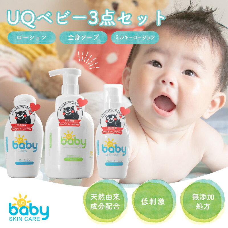 【10%OFFクーポン 店内全商品 27日まで】 ベビーローション 全身泡ソープ ミルキーローション UQベビースキンケア3点セット 赤ちゃん ベビー 国産 植物精油 無添加 敏感肌 カサカサ 乾燥肌 乳液 赤ちゃん 新生児 オーガニック 国産 無添加 保湿 出産祝い ベビーギフト