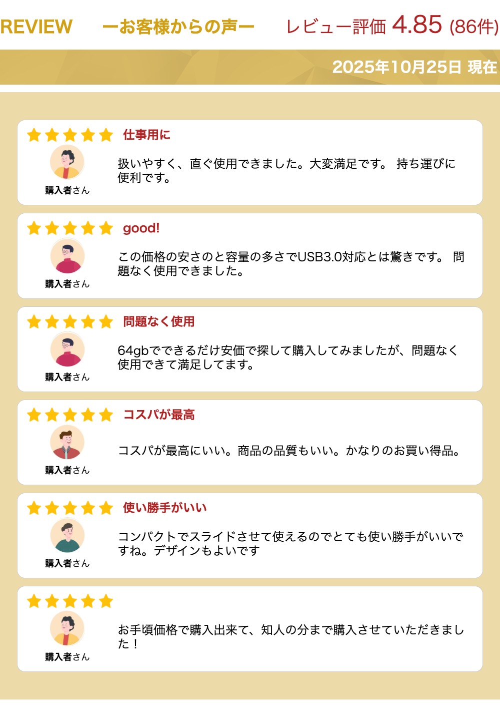 メーカーSP Silicon Power(シリコンパワー) 製品USBメモリ 64GB USB3.0 スライド式 Blaze B05 ブラック 型番SP064GBUF3B05V1K 容量64GB サイズ53.9 x 20 x 10 mm 重量9.2g インターフェイスUSB 3.2 Gen 1 (USB 3.1 Gen 1 & USB 3.0, USB 2.0 下位互換) サポートOSWindows 11/10/8.1/8/7/Vista/XP, Mac OS 10.3.x 以降, Linux 2.6.x 以降 証明BSMI,CE,FCC,KC,EAC 商品特徴片手で簡単操作、キャップレスのスライド式USBコネクタ採用 傷や指紋が付きにくいツヤ消し加工 スタイリッシュな形状、鮮やかなカラーリングでモダンな外観。 バックアップなどの機能を備えたソフト「SP Widget」無料ダウンロード提供 保証期間メーカー5年保証※SSD保証はTBWまたは保証期間に基づきます。 注意事項モニターの発色の具合によって実際のものと色が異なる場合がございます。 関連商品シリコンパワー USBメモリ 64GB USB3.0 USB-A メモ...シリコンパワー USBメモリ 64GB USB3.0 USB-A メモ...シリコンパワー USBメモリ 64GB USB3.1 USB3.0 U...1,080円1,080円1,080円シリコンパワー USBメモリ 32GB USB3.1 USB3.0 U...シリコンパワー USBメモリ 32GB USB3.0 USB-A メモ...シリコンパワー USBメモリ 32GB USB3.0 USB-A メモ...1,080円940円940円シリコンパワー USBメモリ 32GB USB3.0 USB-A メモ...シリコンパワー USBメモリ 32GB USB3.1 USB3.0 U...シリコンパワー USBメモリ 16GB USB3.0 USB-A メモ...940円940円840円シリコンパワー USBメモリ 16GB USB3.0 USB-A メモ...シリコンパワー USBメモリ 16GB USB3.0 USB-A メモ...シリコンパワー USBメモリ 64GB USB3.1 USB3.0 U...840円840円1,350円
