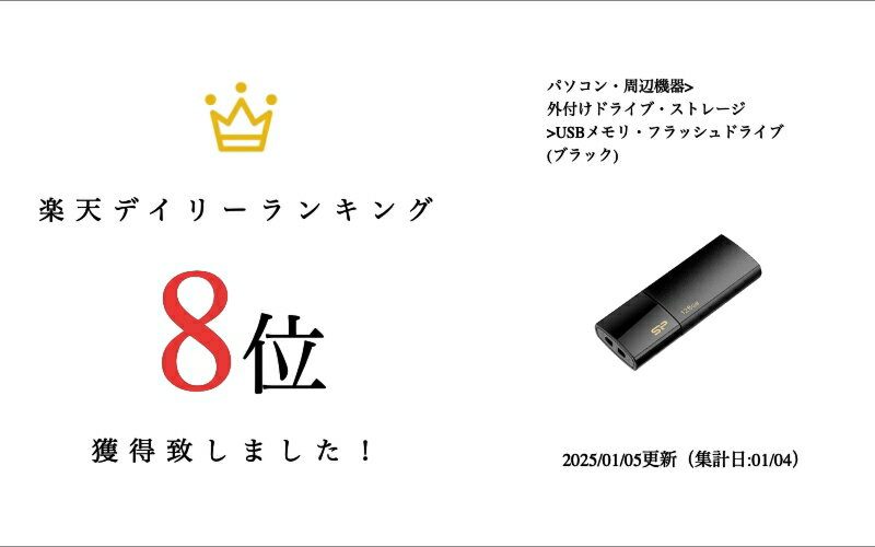 メーカーSP Silicon Power(シリコンパワー) 製品USBメモリ 128GB USB3.0 スライド式 Blaze B05 ブラック 型番SP128GBUF3B05V1K 容量128GB サイズ53.9 x 20 x 10 mm 重量9.2g インターフェイスUSB 3.2 Gen 1 (USB 3.1 Gen 1 & USB 3.0, USB 2.0 下位互換) サポートOSWindows 11/10/8.1/8/7/Vista/XP, Mac OS 10.3.x 以降, Linux 2.6.x 以降 証明BSMI,CE,FCC,KC,EAC 商品特徴片手で簡単操作、キャップレスのスライド式USBコネクタ採用 傷や指紋が付きにくいツヤ消し加工 スタイリッシュな形状、鮮やかなカラーリングでモダンな外観。 バックアップなどの機能を備えたソフト「SP Widget」無料ダウンロード提供 保証期間メーカー5年保証※SSD保証はTBWまたは保証期間に基づきます。 注意事項モニターの発色の具合によって実際のものと色が異なる場合がございます。 関連商品シリコンパワー USBメモリ 128GB USB3.0 USB-A メ...シリコンパワー USBメモリ 128GB USB3.0 USB-A メ...シリコンパワー USBメモリ 128GB USB3.1 USB3.0 ...1,680円1,680円1,680円シリコンパワー USBメモリ 64GB USB3.1 USB3.0 U...シリコンパワー USBメモリ 64GB USB3.1 USB3.0 U...シリコンパワー USBメモリ 64GB USB3.0 USB-A メモ...1,590円1,350円1,080円シリコンパワー USBメモリ 64GB USB3.0 USB-A メモ...シリコンパワー USBメモリ 64GB USB3.0 USB-A メモ...シリコンパワー USBメモリ 256GB USB3.1 USB3.0 ...1,080円1,080円2,780円シリコンパワー USBメモリ 64GB USB3.1 USB3.0 U...シリコンパワー USBメモリ 32GB USB3.1 USB3.0 U...シリコンパワー USBメモリ 8GB USB3.0 USB-A メモリ...1,080円1,080円790円
