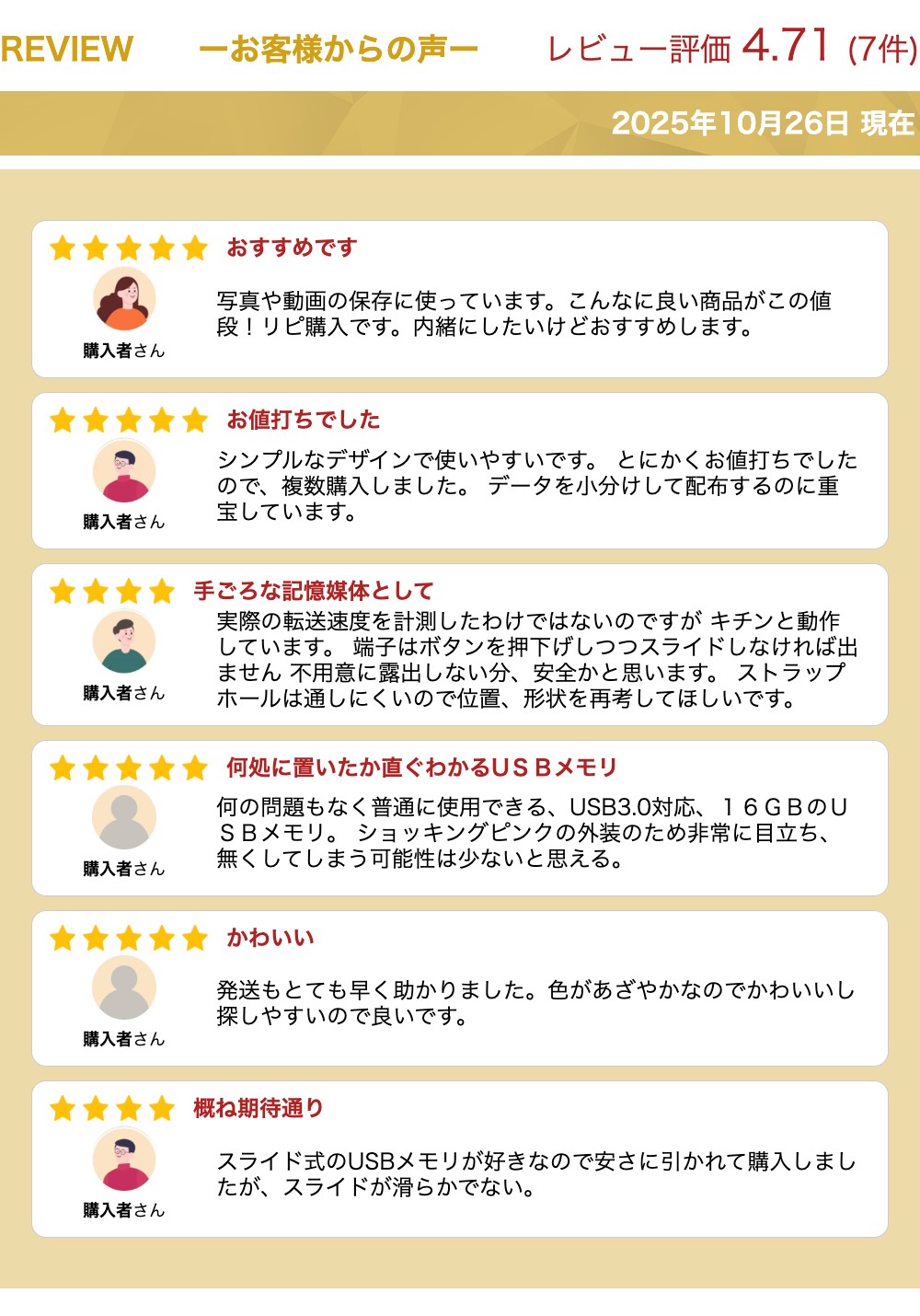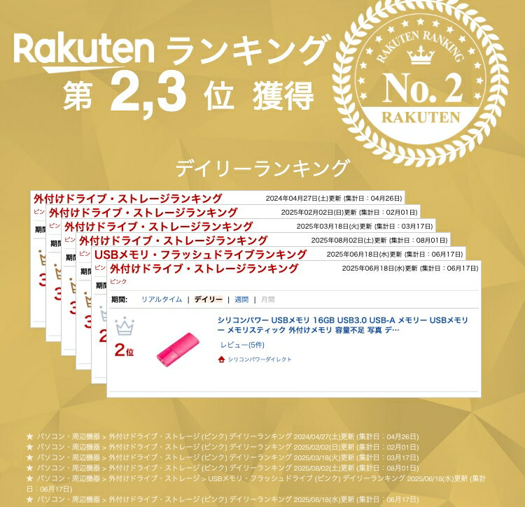 メーカーSP Silicon Power(シリコンパワー) 製品USBメモリ 16GB USB3.0 スライド式 Blaze B05 ピンク 型番SP016GBUF3B05V1H 容量16GB サイズ53.9 x 20 x 10 mm 重量9.2g インターフェイスUSB 3.2 Gen 1 (USB 3.1 Gen 1 & USB 3.0, USB 2.0 下位互換) サポートOSWindows 11/10/8.1/8/7/Vista/XP, Mac OS 10.3.x 以降, Linux 2.6.x 以降 証明BSMI,CE,FCC,KC,EAC 商品特徴片手で簡単操作、キャップレスのスライド式USBコネクタ採用 傷や指紋が付きにくいツヤ消し加工 スタイリッシュな形状、鮮やかなカラーリングでモダンな外観。 バックアップなどの機能を備えたソフト「SP Widget」無料ダウンロード提供 保証期間メーカー5年保証※SSD保証はTBWまたは保証期間に基づきます。 注意事項モニターの発色の具合によって実際のものと色が異なる場合がございます。 関連商品シリコンパワー USBメモリ 16GB USB3.0 USB-A メモ...シリコンパワー USBメモリ 16GB USB3.0 USB-A メモ...シリコンパワー USBメモリ 16GB USB3.1 USB3.0 U...840円840円840円シリコンパワー USBメモリ 8GB USB3.0 USB-A メモリ...シリコンパワー USBメモリ 8GB USB3.0 USB-A メモリ...シリコンパワー USBメモリ 8GB USB3.0 USB-A メモリ...790円790円790円シリコンパワー USBメモリ 32GB USB3.0 USB-A メモ...シリコンパワー USBメモリ 32GB USB3.0 USB-A メモ...シリコンパワー USBメモリ 32GB USB3.0 USB-A メモ...940円940円940円シリコンパワー USBメモリ 32GB USB3.1 USB3.0 U...シリコンパワー USBメモリ 64GB USB3.0 USB-A メモ...シリコンパワー USBメモリ 64GB USB3.0 USB-A メモ...940円1,080円1,080円バリエーション 8GB ネイビーブルー 8GB ピンク 8GB ブラック 16GB ネイビーブルー 16GB ブラック 32GB ネイビーブルー 32GB ピンク 32GB ブラック