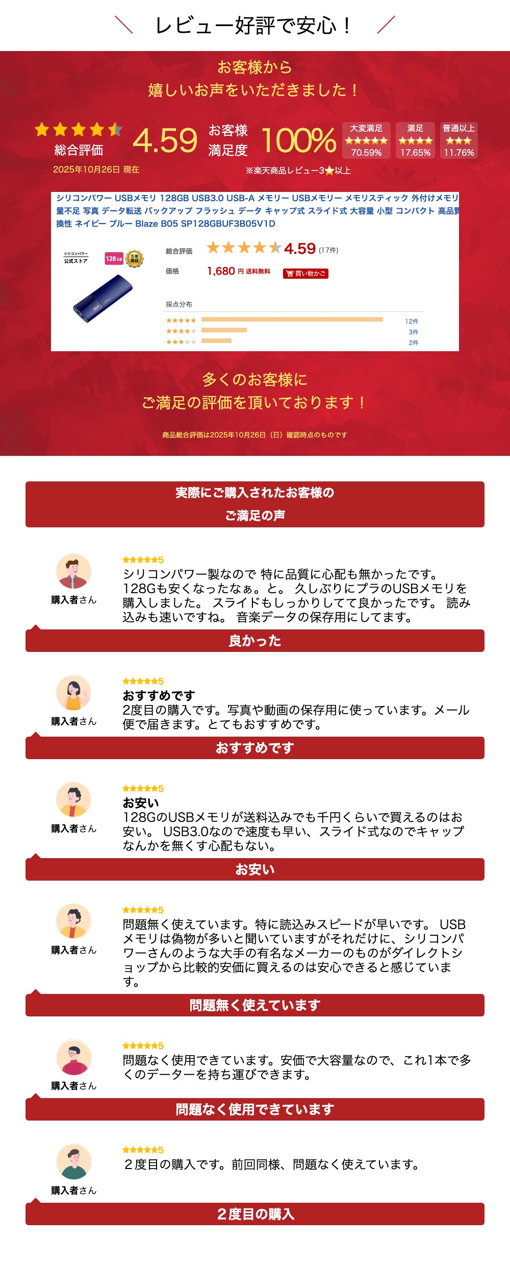 メーカーSP Silicon Power(シリコンパワー) 製品USBメモリ 128GB USB3.0 スライド式 Blaze B05 ネイビー 型番SP128GBUF3B05V1D 容量128GB サイズ53.9 x 20 x 10 mm 重量9.2g インターフェイスUSB 3.2 Gen 1 (USB 3.1 Gen 1 & USB 3.0, USB 2.0 下位互換) サポートOSWindows 11/10/8.1/8/7/Vista/XP, Mac OS 10.3.x 以降, Linux 2.6.x 以降 証明BSMI,CE,FCC,KC,EAC 商品特徴片手で簡単操作、キャップレスのスライド式USBコネクタ採用 傷や指紋が付きにくいツヤ消し加工 スタイリッシュな形状、鮮やかなカラーリングでモダンな外観。 バックアップなどの機能を備えたソフト「SP Widget」無料ダウンロード提供 保証期間メーカー5年保証※SSD保証はTBWまたは保証期間に基づきます。 注意事項モニターの発色の具合によって実際のものと色が異なる場合がございます。 関連商品シリコンパワー USBメモリ 128GB USB3.0 USB-A メ...シリコンパワー USBメモリ 128GB USB3.1 USB3.0 ...シリコンパワー USBメモリ 128GB USB3.0 USB-A メ...1,680円1,680円1,680円シリコンパワー USBメモリ 64GB USB3.1 USB3.0 U...シリコンパワー USBメモリ 64GB USB3.0 USB-A メモ...シリコンパワー USBメモリ 64GB USB3.0 USB-A メモ...1,350円1,080円1,080円シリコンパワー USBメモリ 64GB USB3.0 USB-A メモ...シリコンパワー USBメモリ 64GB USB3.1 USB3.0 U...シリコンパワー USBメモリ 32GB USB3.1 USB3.0 U...1,080円1,080円1,080円シリコンパワー USBメモリ 64GB USB3.1 USB3.0 U...シリコンパワー USBメモリ 8GB USB3.0 USB-A メモリ...シリコンパワー USBメモリ 8GB USB3.0 USB-A メモリ...1,590円790円790円