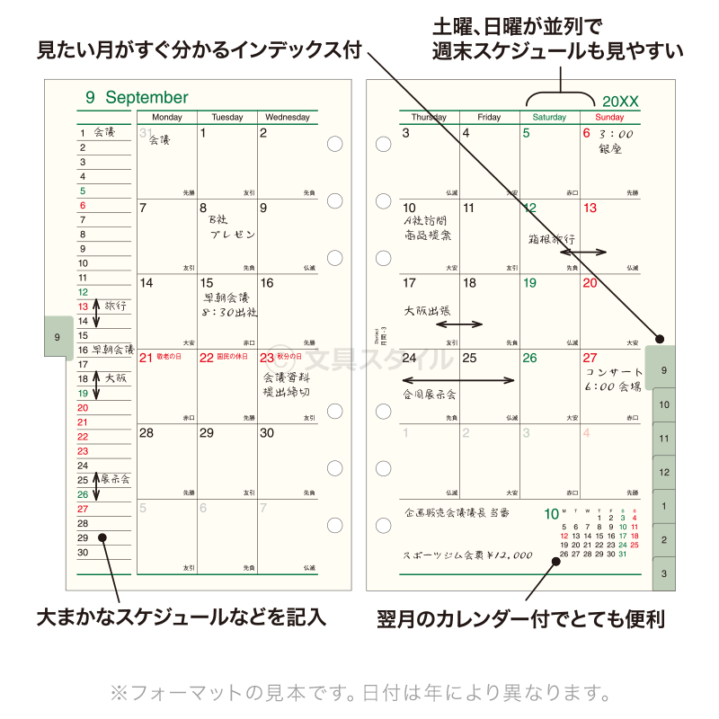 \本日Point5倍/【2026年版システム手帳リフィル】Davinci ダ・ヴィンチ バイブルサイズ 6穴 月間-3 見開き両面1ヶ月 ブロック式 月曜始まり インデックス付 1月/4月始まり両対応 DR2620(メール便対象送料込)